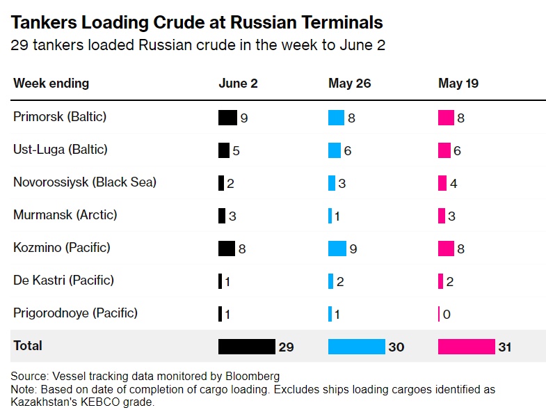 油轮在俄罗斯码头装载原油——在截至6月2日的一周内,有29艘油轮装载了俄罗斯原油