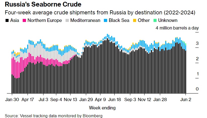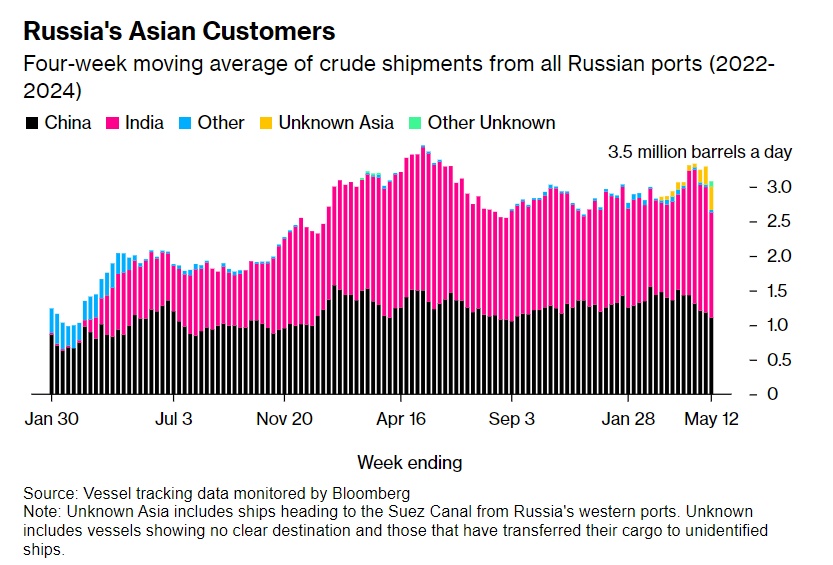 俄罗斯的亚洲客户——俄罗斯所有港口原油运输的四周移动平均值(2022-2024年)