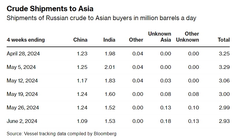 最新的统计数据发现,俄罗斯运往最大需求地——亚洲的原油需求客户的原油数量(包括未显示最终目的地的原油)在截至 6 月 2 日的四周期限内统计数据降至 11 周以来的最低点 293 万桶/日,而截至5月26日的四周内则为299万桶/日。