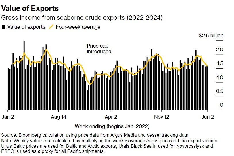 在截至6月2日的七天内,俄罗斯原油出口总计价值从截至5月26日的约15.6亿美元小幅上升至15.7亿美元,这得益于国际原油基准——布伦特原油在此期间小幅上涨。相比之下,俄罗斯原油出口的四周平均收入下降了约7,200万美元,至每周15.9亿美元,为2月份以来的最低水平。