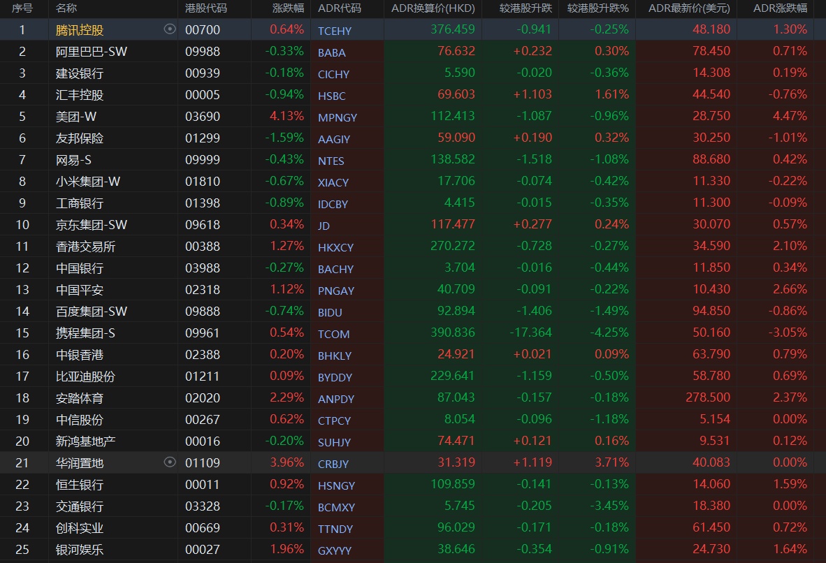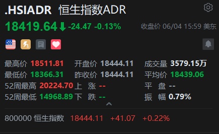 智通财经APP获悉,周二美股三大指数全线上涨,恒生指数ADR下跌,按比例计算,收报18419.64点,较香港收市下跌24.47点或0.13%。
