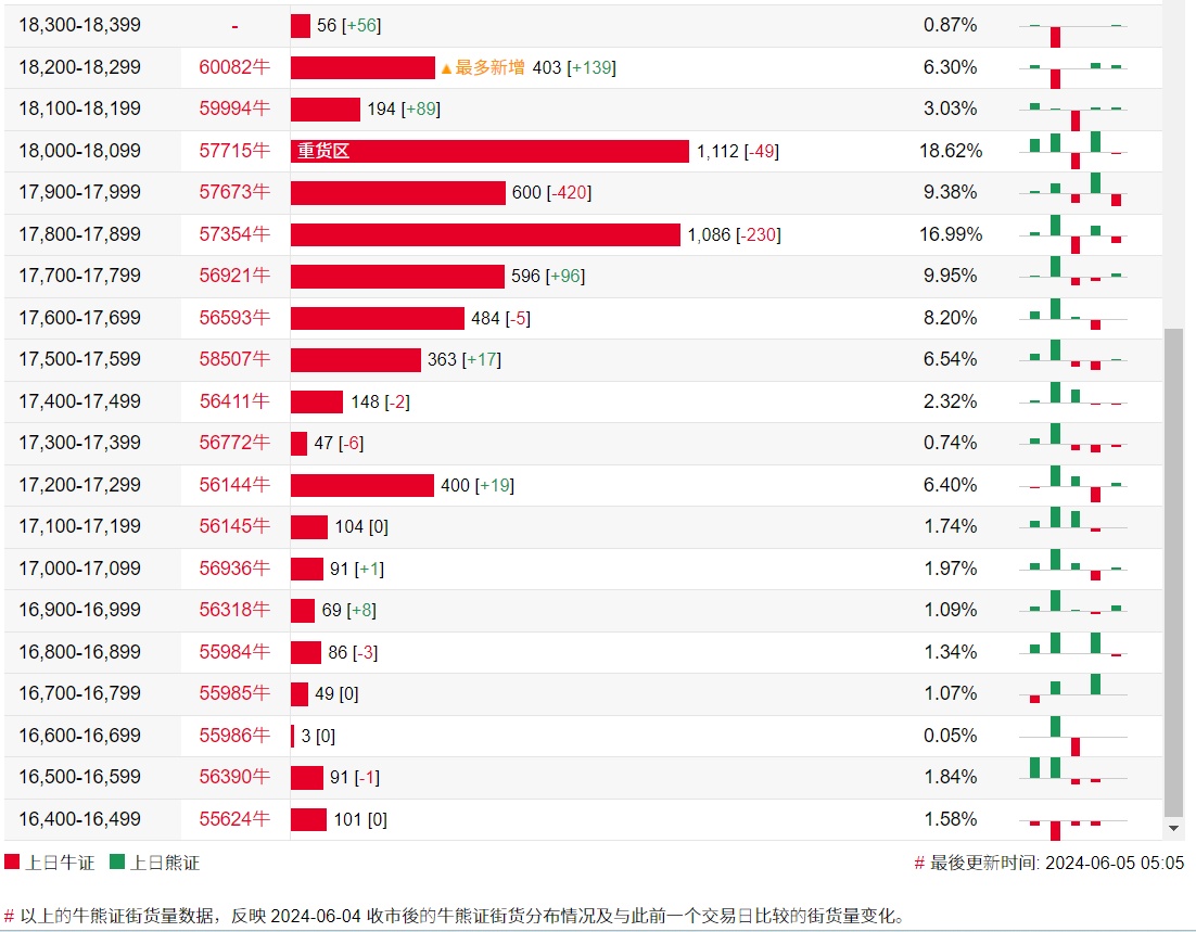 牛证街货重货区在18000-18099区间,该区间最新牛证数量为1112张,较上一交易日减少49张;最多新增在18200-18299区间,该区间最新牛证数量为403张,较上一交易日增加139张。