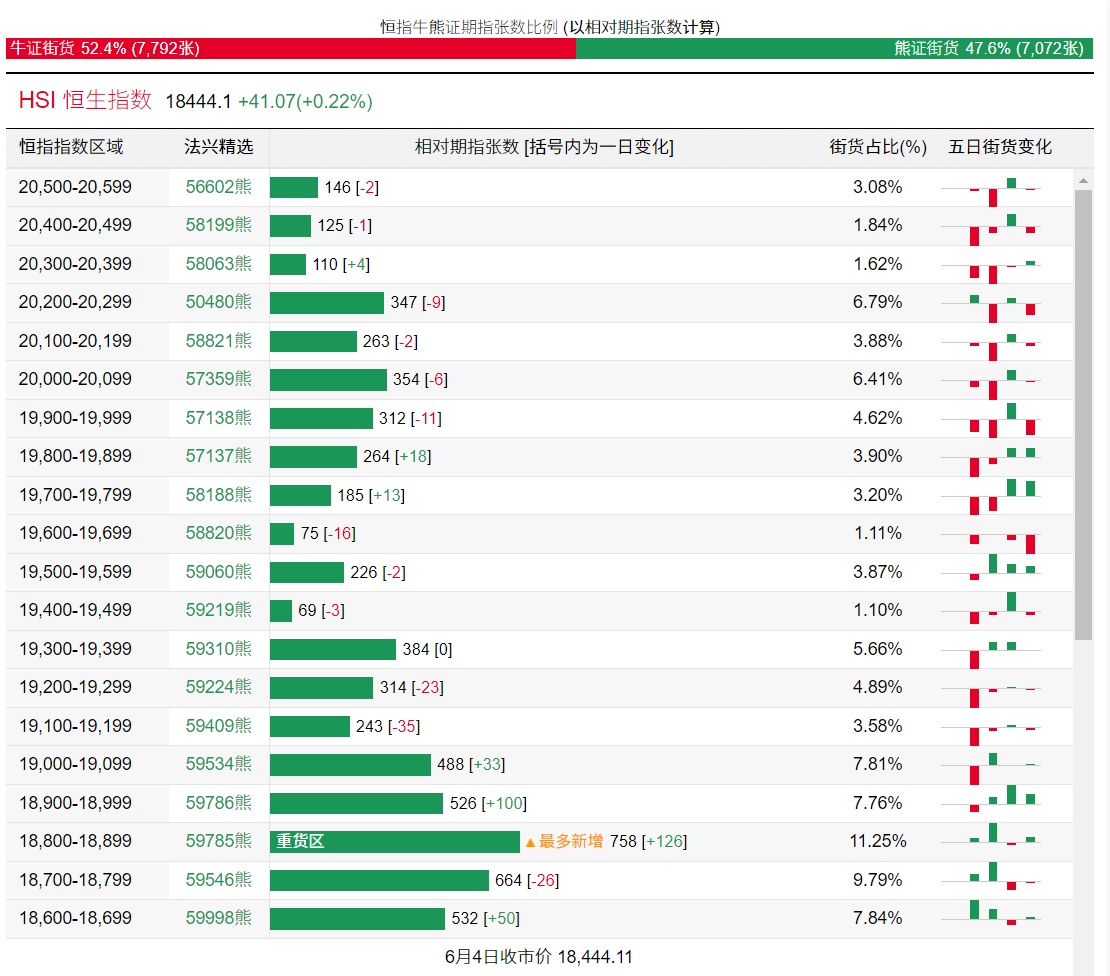 法兴恒指牛熊证街货分布图中的数据显示,熊证街货重货区在18800-18899区间,该区间最新熊证数量为758张,较上一交易日增加126张;最多新增在相同区间。