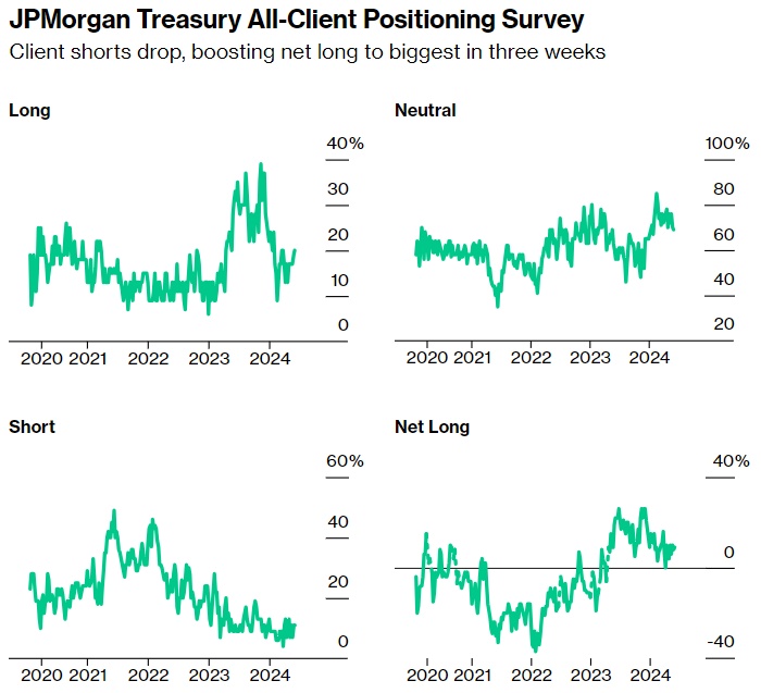 在截至6月3日的一周内,摩根大通美国国债客户小幅增加多头头寸,将直接头寸推高至3月25日以来最高水平,为1月29日以来最少的中性头寸。本周空头头寸持平。