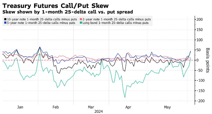 随着本周美债市场延续涨势,通过期权市场对冲美债走势的成本已转变为为对冲所有期限公债的涨势而支付的溢价。在10年期美国国债中,对冲上涨的成本已升至2月份以来的最高水平。新发现的美国国债看涨期权与看跌期权的支出,导致近期建立的多头多头押注出现一些获利了结,包括在周二JOLTS公布弱于预期的职位空缺数据后出现的5年期和10年期美债期权看涨期权大量出脱。这引发10年期美债收益率跌至5月16日以来最低,同时挑战100日移动均线和200日移动均线水准。