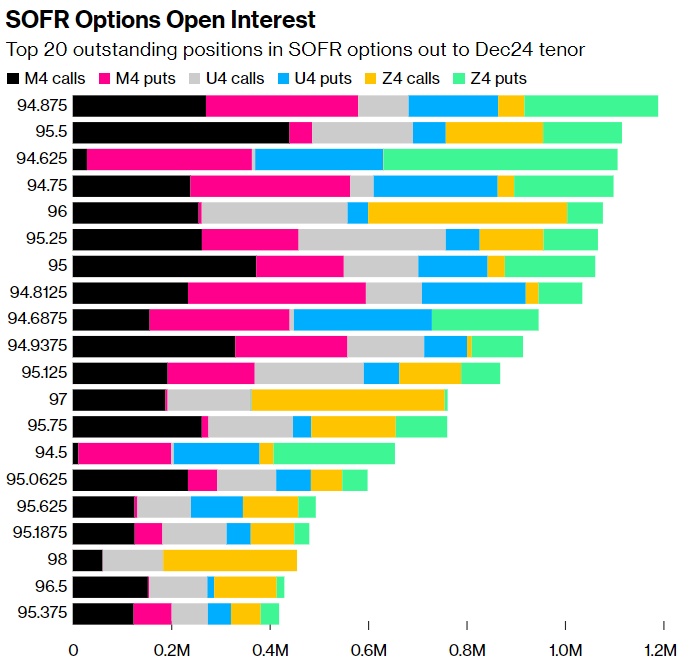 最受欢迎的SOFR期权仍在94.875水平,未完成交易集中在如SFRU4 94.875/94.8125/94.75蝶式看跌策略和SFRU4 94.8125/94.875/94.9375/95.00鹰式看涨策略——上周被买入的交易。94.625行权价位附近也有大量仓位,包括9月24日/ 12月24日的SOFR 94.875/94.625看跌价差策略。