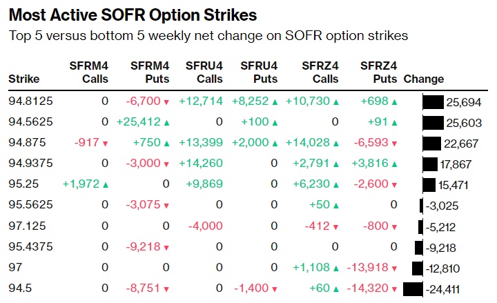 过去一周,在94.8125上行期权中出现了最大的未平仓合约变动,包括SFRU4 94.8125/94.875/94.9375/95.00鹰式看涨策略的买家。在94.5625的执行价中,未平仓合约也出现了可观的跃升。在94.50的执行价中出现了最严重的平仓,主要是由于12月24日看跌期权的平仓。