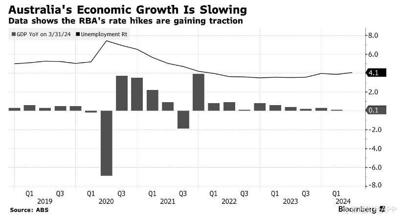 智通财经APP获悉,由于利率上升和生活成本压力严重影响了家庭和更广泛的经济活动,今年前三个月澳大利亚经济几乎陷入停滞。周三公布的数据显示,澳大利亚第一季度季调后国内生产总值(GDP)环比仅增长0.1%,低于市场预期的0.2%;GDP同比增长1.1%,低于市场预期的1.2%。