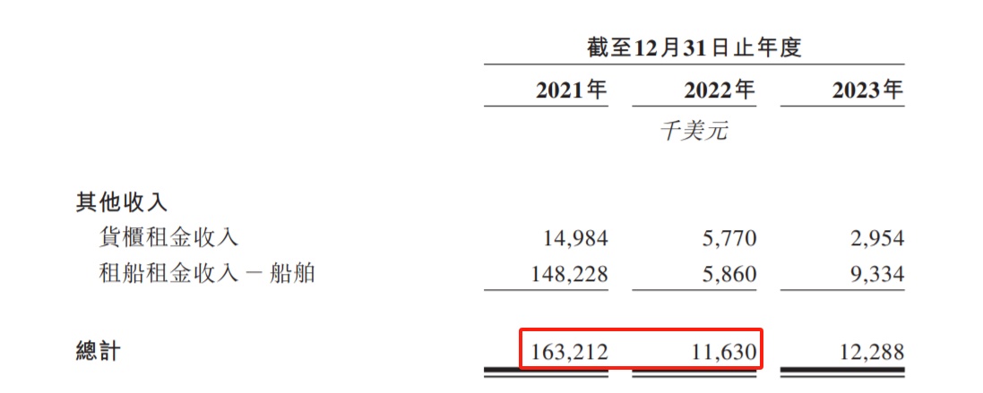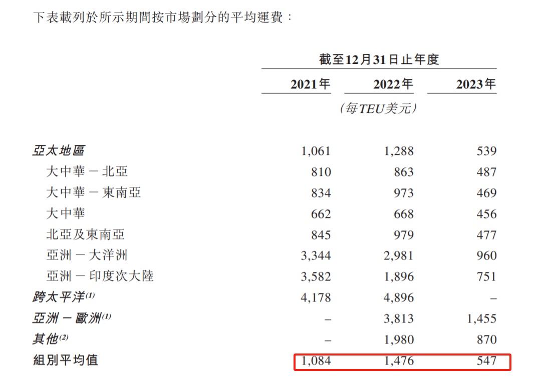 从业绩来看,德翔海运2021年-2023年的收入分别约为18.37亿美元、24.43亿美元、8.75亿美元,同期的航运量分别为1,583,574 TEU、1,559,142 TEU及1,466,431 TEU,对应的平均运费分别为每TEU 1084美元、1476美元、547美元。