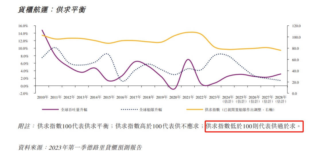 从供给端来看,据德路里货柜预测报告显示,自2023年开始,货柜航运供求指数便处于80左右的水平,这代表着市场供给大于需求,这也是自2022年初以来货运价格明显调整的原因。