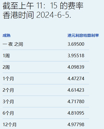 智通财经APP获悉,6月5日,港元拆息普遍走软,其中,一星期拆息进一步跌至3.95518%,而与楼按相关的一个月拆息亦两连跌,报4.47274%,创逾两周新低。反映银行资金成本的三个月拆息维持4.71780%,续创逾两周新低。不过,隔夜息回升至3.6950%。一年期亦微升至4.97798%。