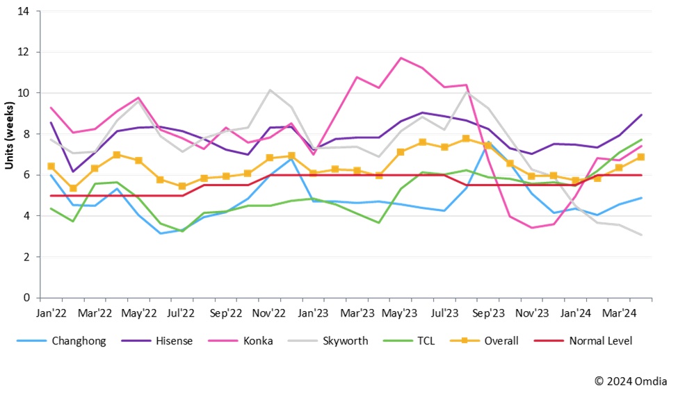 根据预估,海信之所以战略性地提高库存水平,是为了实现2024年出货量增长的目标,当然在此过程中若能与面板企业特别是战略面板企业谈较有优势的价格,这将更加有助于海信年度出货目标的实现。根据Omdia预测,到4月底,海信的库存水平将达到9周的水位。