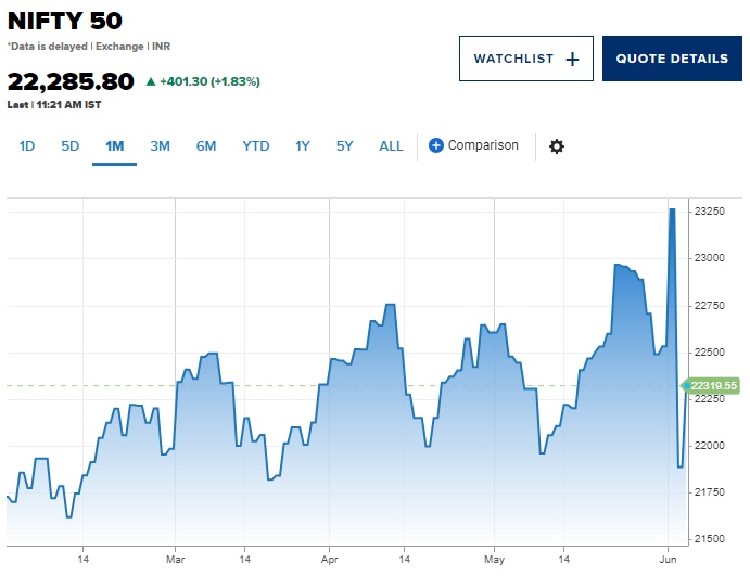 周二的下跌意味着Sensex指数在一天之内抹去了今年以来的所有涨幅,从周一年初迄今的5.85%涨幅转变至0.22%的跌幅。与此同时,截至周一,Nifty 50指数今年迄今的涨幅为7%,但周二下跌后今年以来的涨幅剧烈收窄至0.7%。不过,周三,也就是选举结果公布的第二天,Nifty指数反弹,上涨1.83%,Sensex指数上涨0.26%。