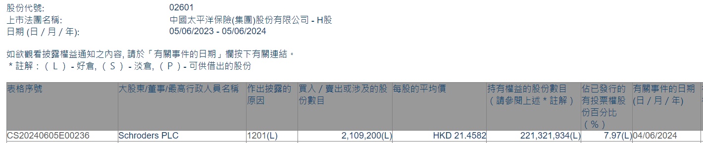 智通财经APP获悉,香港联交所最新资料显示,6月4日,Schroders PLC减持中国太保(02601)210.92万股,每股作价21.4582港元,总金额约为4525.96万港元。减持后最新持股数目约为2.21亿股,最新持股比例为7.97%。