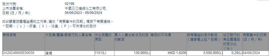 智通财经APP获悉,香港联交所最新资料显示,6月4日,执行董事兼董事会秘书陈娴增持中国三江化工(02198)13万股,平均每股作价为1.62港元,总金额为21.06万港元。增持后最新持股数目为350万股,持股比例为0.29%。