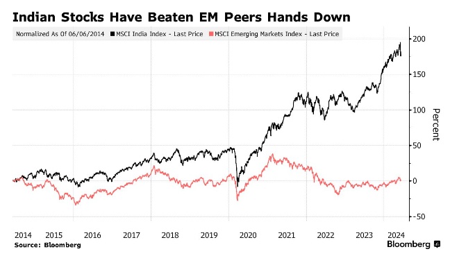 印度的经济增长和其股票市场的价值同步发展,在过去20年里增长了数倍。自莫迪上台以来的十年里,股市增长了200%以上,在周二的暴跌之前,市值接近5万亿美元,其中1.5万亿美元是在去年增加的。这是该指数连续第九年上涨,表现优于MSCI新兴市场指数。