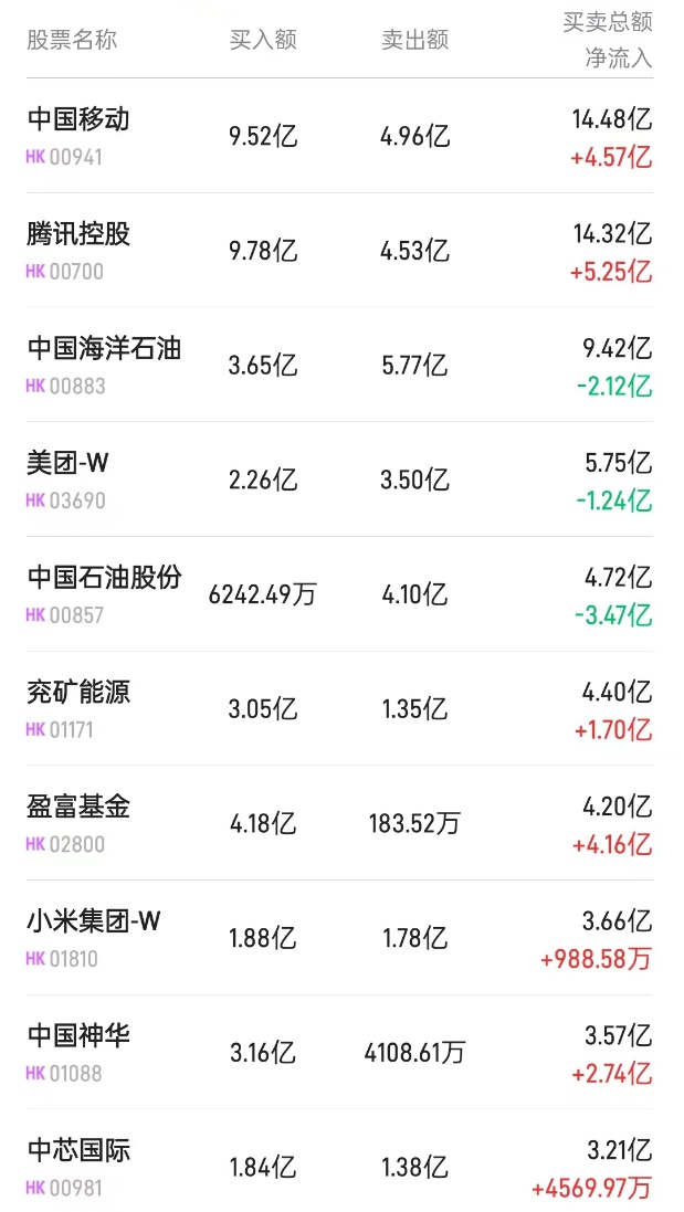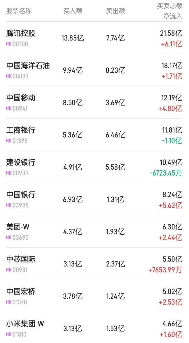 北水净买入最多的个股是腾讯(00700)、中国移动(00941)、中国银行(03988)。北水净卖出最多的个股是中石油(00857)、工商银行(01398)、建设银行(00939)。