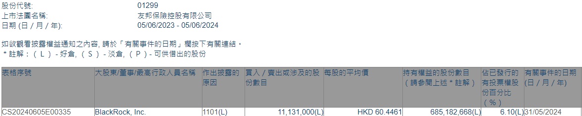 智通财经APP获悉,香港联交所最新资料显示,5月31日,贝莱德增持友邦保险(01299)1113.1万股,平均每股作价60.4461港元,总金额约为6.73亿港元。增持后最新持股数目约为6.85亿股,持股比例为6.1%。