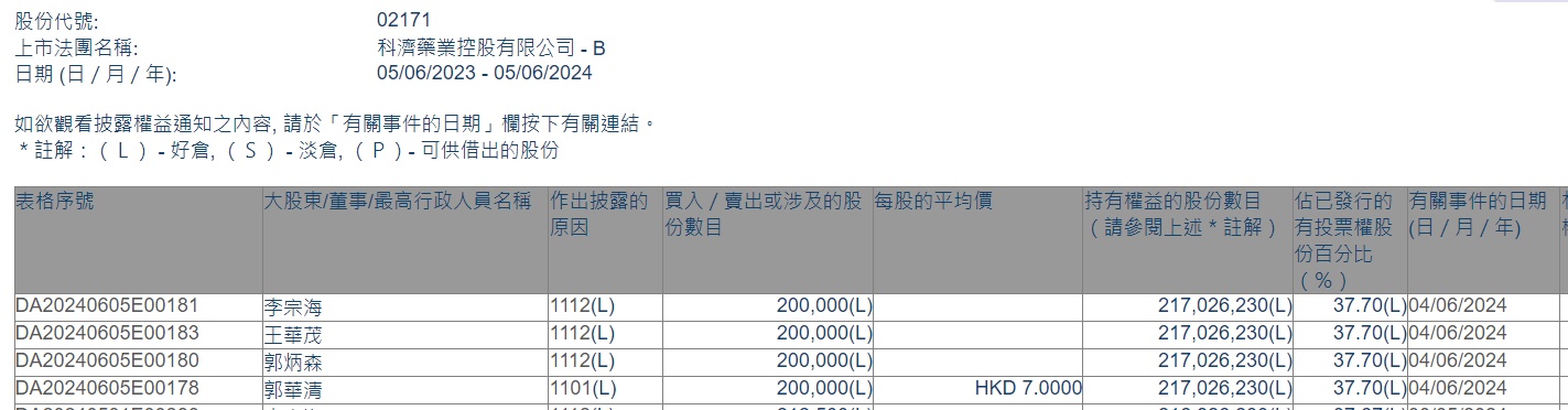 智通财经APP获悉,香港联交所最新资料显示,6月4日,非执行董事郭华清增持科济药业-B(02171)20万股,平均每股作价为7港元,总金额140万港元。增持后最新持股数目约为2.17亿股,持股比例为37.70%。