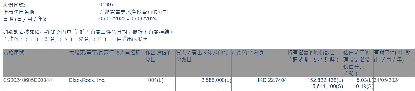 智通财经APP获悉,香港联交所最新资料显示,5月31日,贝莱德增持九龙仓置业(01997)258.8万股,每股作价22.7404港元,总金额约为5885.22万港元。增持后最新持股数目约为1.53亿股,最新持股比例为5.03%。