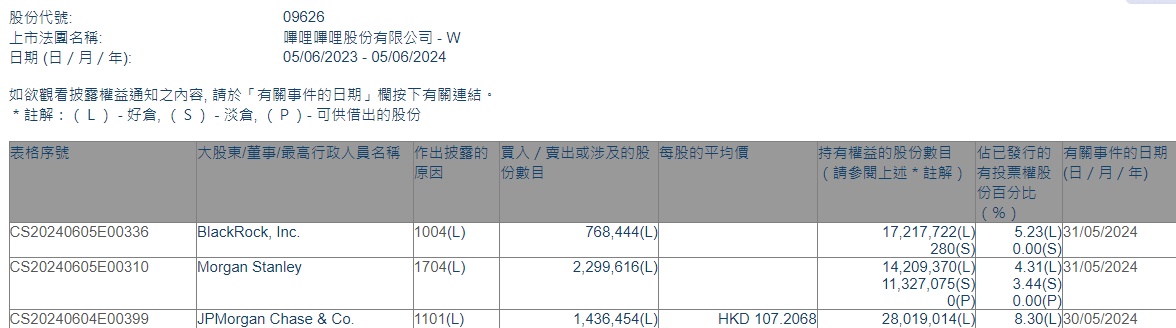智通财经APP获悉,香港联交所最新资料显示,5月30日,摩根大通增持哔哩哔哩-W(09626)143.6454万股,平均每股作价107.2068港元,总金额约为1.54亿港元。增持后最新持股数目约为2801.9万股,持股比例为8.3%。