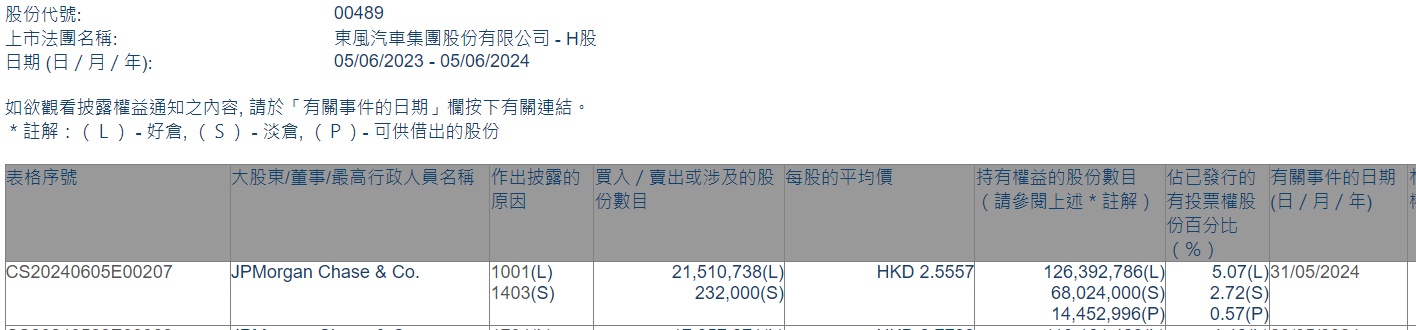 智通财经APP获悉,香港联交所最新资料显示,5月31日,小摩增持东风汽车(00489)2151.0738万股,每股作价2.5557港元,总金额约为5497.50万港元。增持后最新持股数目约为1.26亿股,最新持股比例为5.07%。