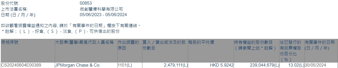 智通财经APP获悉,香港联交所最新资料显示,5月30日,摩根大通增持微创医疗(00853)247.9111万股,平均每股作价5.9242港元,总金额约为1468.67万港元。增持后最新持股数目约为2.39亿股,持股比例为13.02%。