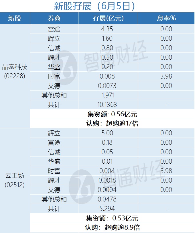 智通财经APP获悉,晶泰科技(02228)、云工场(02512)正在招股中。截至6月5日,辉立、富途等券商合计分别为晶泰科技借出孖展10.1363亿港元,认购超购逾17倍;为云工场借出孖展5.294亿港元,认购超购逾8.9倍。