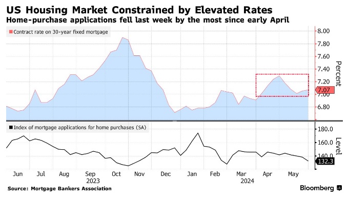 美国抵押贷款银行家协会(MBA)周三公布的数据显示,截至5月31日当周(包括阵亡将士纪念日假期),购房抵押贷款申请指数下降了4.4%。