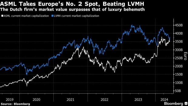 智通财经获悉,光刻机巨头阿斯麦(ASML.US)成为欧洲第二大上市公司,市值首次超过LVMH集团(LVMHF.US)。周三,阿斯麦股价上涨8.1%,估值约为3770亿欧元(合4100亿美元)。这比奢侈品集团LVMH高出约6.41亿欧元。在欧洲市场,阿斯麦的市值仅低于诺和诺德(NVO.US)。