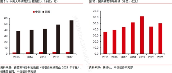 另一方面,在资本市场投资领域,中信证券日前发布行业研报表示,目前国内核药市场空间十分广阔,我国核药人均支出远低于美国水平,国内核药市场规模约为50亿元。