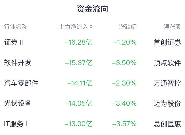 主力资金方面,资金青睐消费电子、贵金属、白色家电等行业;资金出逃证券、软件开发、汽车零部件等行业。