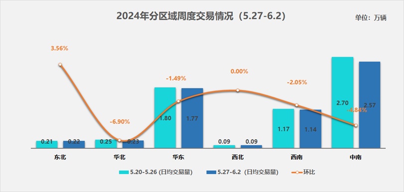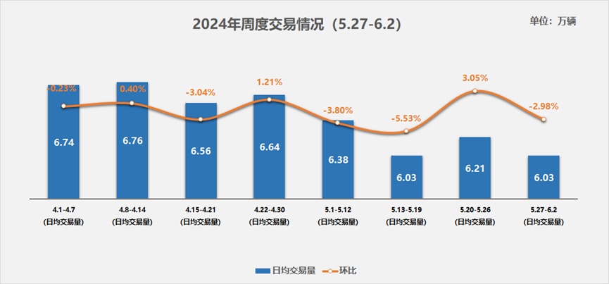 2024年5月27日-6月2日,二手车日均交易量6.03万辆,环比上周下降了2.98%,这一变化显示,在上周市场企稳回升之后,二手车市场再次面临了挑战。5月整体市场基本维持在低位区域,反映出当前二手车市场增长乏力的现状。