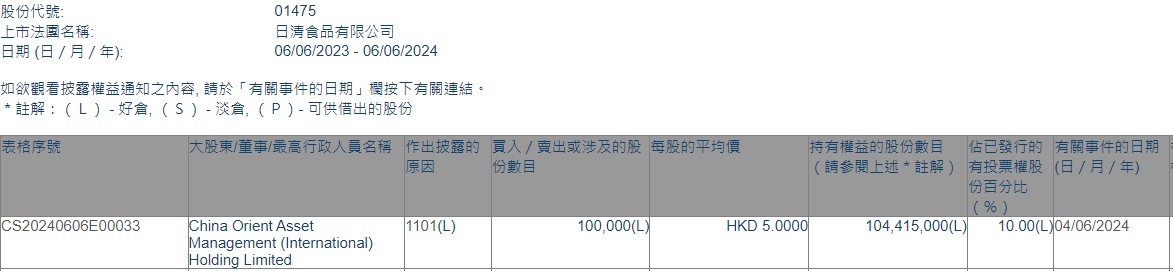 智通财经APP获悉,香港联交所最新资料显示,6月4日,China Orient Asset Management (International) Holding Limited增持日清食品(01475)10万股,每股作价5港元,总金额为50万港元。增持后最新持股数目为1.04亿股,最新持股比例为10%。