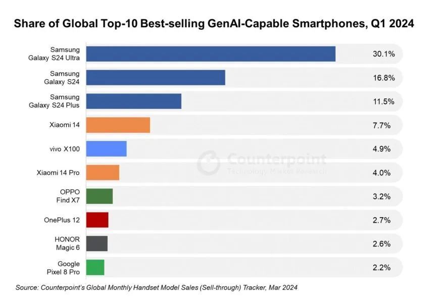 Research发文表示,具备GenAI功能的智能手机在2024年第一季度的全球智能手机销量中所占比例从上一季度的1.3%激增至6%。具备GenAI功能的智能手机销量中,高端机型占比超过70%。三星占据了该细分市场的前三名,贡献了58%的份额。同时,在2024年第一季度最畅销的十大GenAI功能智能手机中,有六款来自中国厂商。