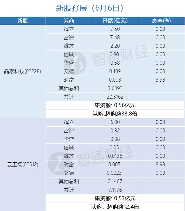 智通财经APP获悉,晶泰科技(02228)、云工场(02512)正在招股中。截至6月6日,辉立、富途等券商合计分别为晶泰科技借出孖展22.3162亿港元,认购超购逾38.8倍;为云工场借出孖展7.1176亿港元,认购超购逾12.4倍。