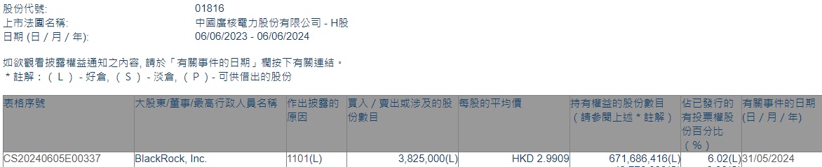智通财经APP获悉,香港联交所最新资料显示,5月31日,贝莱德增持中广核电力(01816)382.5万股,平均每股作价2.9909港元,总金额约1144.02万港元。增持后最新持股数目约6.72亿股,持股比例为6.02%。