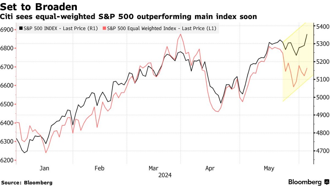 智通财经APP获悉,花旗集团全球财富管理部门展望了2024年的股市前景,认为上半年的强劲表现有望持续至年底,并且可能扩散至市场先前较为平静的领域。该部门预测,标普500等权重指数——即指数中每个成分股权重相同的指数——可能很快会超越传统的市值加权标普500指数。尽管美国科技巨头近期几乎独立支撑了市场,但花旗认为,其他公司得益于持续的经济增长和利润上升,预计将在年内剩余时间里拓宽股票市场的回报基础。