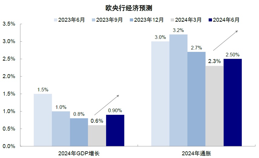 图表:欧央行分别上调2024年GDP增长至0.9%,上调CPI至2.5%