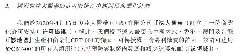 招股书显示,2020年4月,拨康视云与远大医药签订了一份商业化许可安排,授予远大医药在大中华区生产和商业化CBT-001的独家、可转授权、含专利权费的许可,该许可适用于CBT-001的所有人类用途(包括预防翼状胬肉发展和减少结膜出血)。
