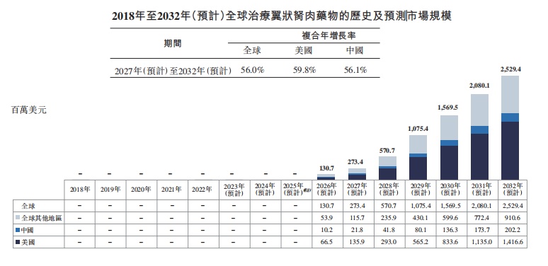 弗若斯特沙利文报告显示,CBT-001对应的全球治疗翼状胬肉药物的市场规模预计将于2027年达到273.4百万美元及于2032年达到2,529.4百万美元,复合年增长率为56.0%。美国治疗翼状胬肉药物的市场规模预计于2027年达到135.9百万美元及于2032年达到1,416.6百万美元,复合年增长率为59.8%。中国治疗翼状胬肉药物的市场规模预计于2027年达到21.8百万美元及于2032年达到202.2百万美元,复合年增长率为56.1%。