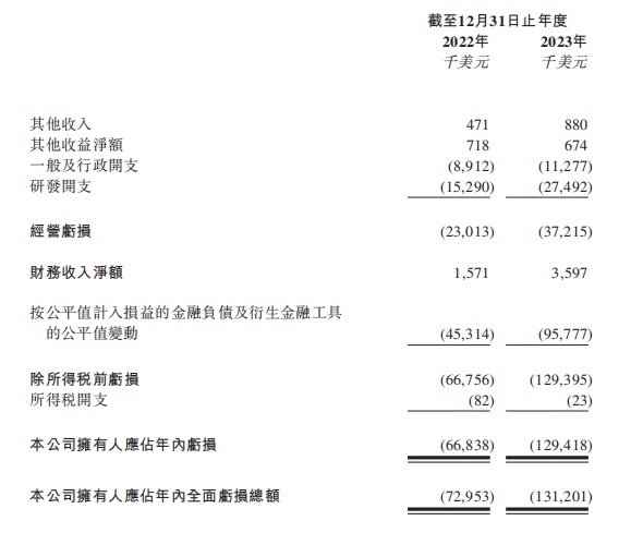 成立至今,拨康视云自我造血能力仍为零。招股书显示,2022年至2023年,拨康视云公司拥有人应占年内全面亏损总额分别为7295.3万美元、1.31亿美元,两年累积亏损超2亿美元。值得关注的是,拨康视云的亏损额持续扩大。