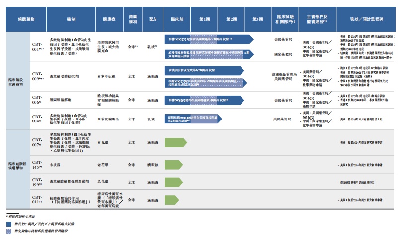 截至最后实际可行日期,全球有3款适用于翼胬肉及减少结膜充血的临床阶段候选药物,其中2款处于第2期临床试验阶段及其中1款处于第3期临床试验阶段,即CBT-001。