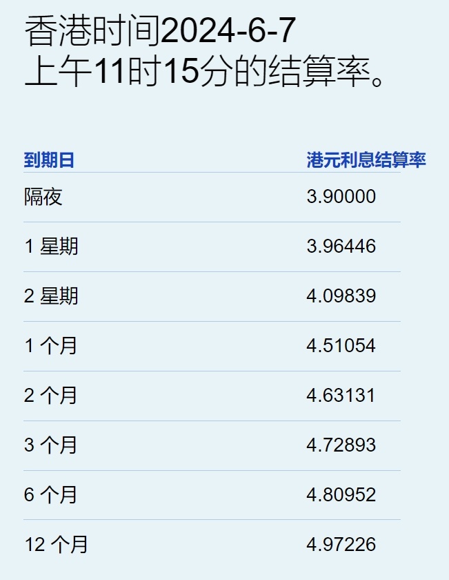 智通财经APP获悉,6月7日,港元拆息个别发展。其中,隔夜息升20基点至3.9%;一周拆息和两周期分别为3.96446%和4.09839%。与楼按相关的一个月拆息报4.51054%,升0.983基点,连升两日。