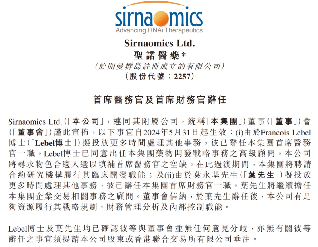 继今年三月大股东被强制平仓后,圣诺医药-B(02257)的管理层又爆出大新闻。6月3日港股盘前,圣诺医药发布公告称,其首席医务官Francois Lebel、首席财务官叶永基已于5月31日双双离职。