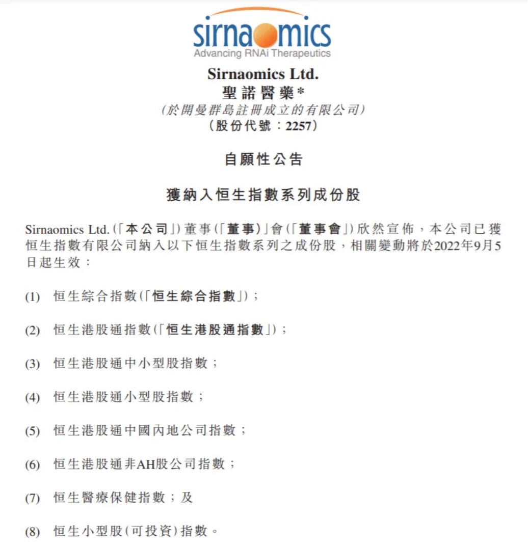 当时,圣诺医药意气风发地发公告表示,其已成为包括恒生综合指数、恒生港股通指数、恒生港股通中小型股指数、恒生港股通小型股指数、恒生港股通中国内地公司指数、恒生港股通非AH股公司指数、恒生医疗保健指数及恒生小型股(可投资)指数在内的8个恒生指数成分股。