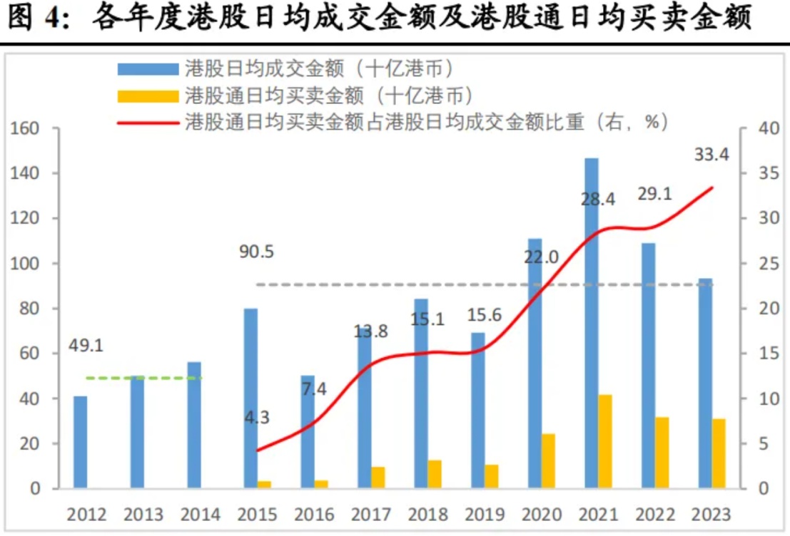 数据显示,自2014年底沪港通开通以来至今年4月底,南向资金持续流入港股市场,累计净买入港股3.1万亿港元,成为港股市场重要买家。从日均成交量看,沪港通开通后的2015-2023年,港股日均成交金额跃升至905亿港元,并且通过港股通日均买卖港股金额(双边)占港股日均成交金额的比重逐步上升,从2015年的4.3%升至2023年的33.4%。足以说明南向资金持续流入对于港股流动性的改善作用。
