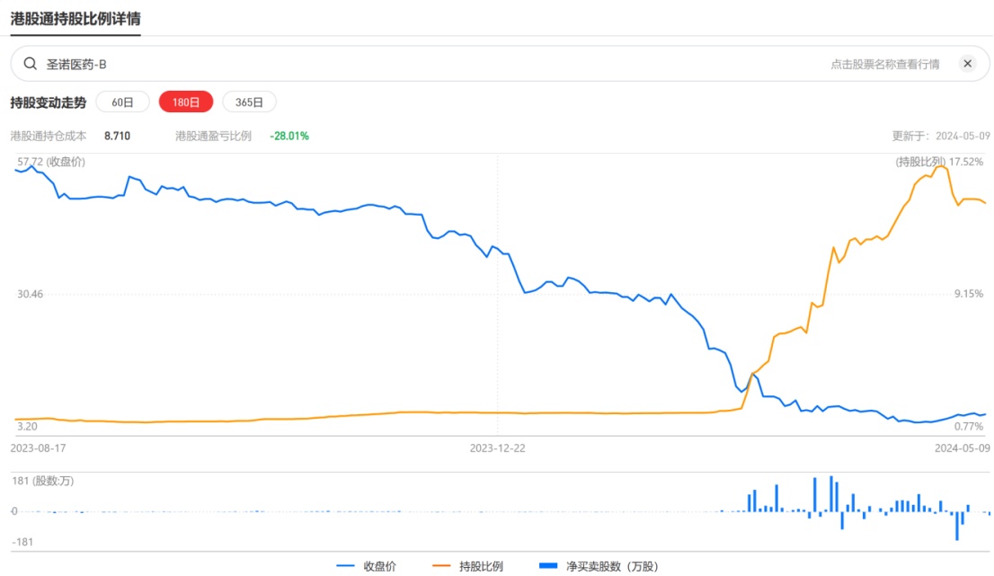 从圣诺医药的港股通持股比例来看,从今年3月起,其港股通持股比例便一路走高,从3月1日的2.4%到4月最高的17.52%,虽然近期港股通持股比例有所下滑,但仍超过14%。