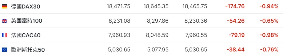 2. 截至发稿,德国DAX指数跌0.94%,英国富时100指数跌0.65%,法国CAC40指数跌0.98%,欧洲斯托克50指数跌0.76%。