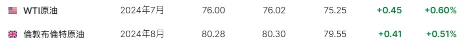 3. 截至发稿,WTI原油涨0.60%,报76.00美元/桶。布伦特原油涨0.51%,报80.28美元/桶。